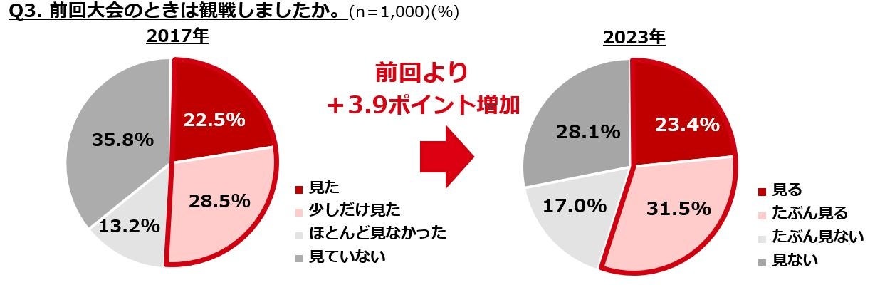 ・前回大会を見た人は51%で、ほとんど差はないものの3.9ポイント増加。