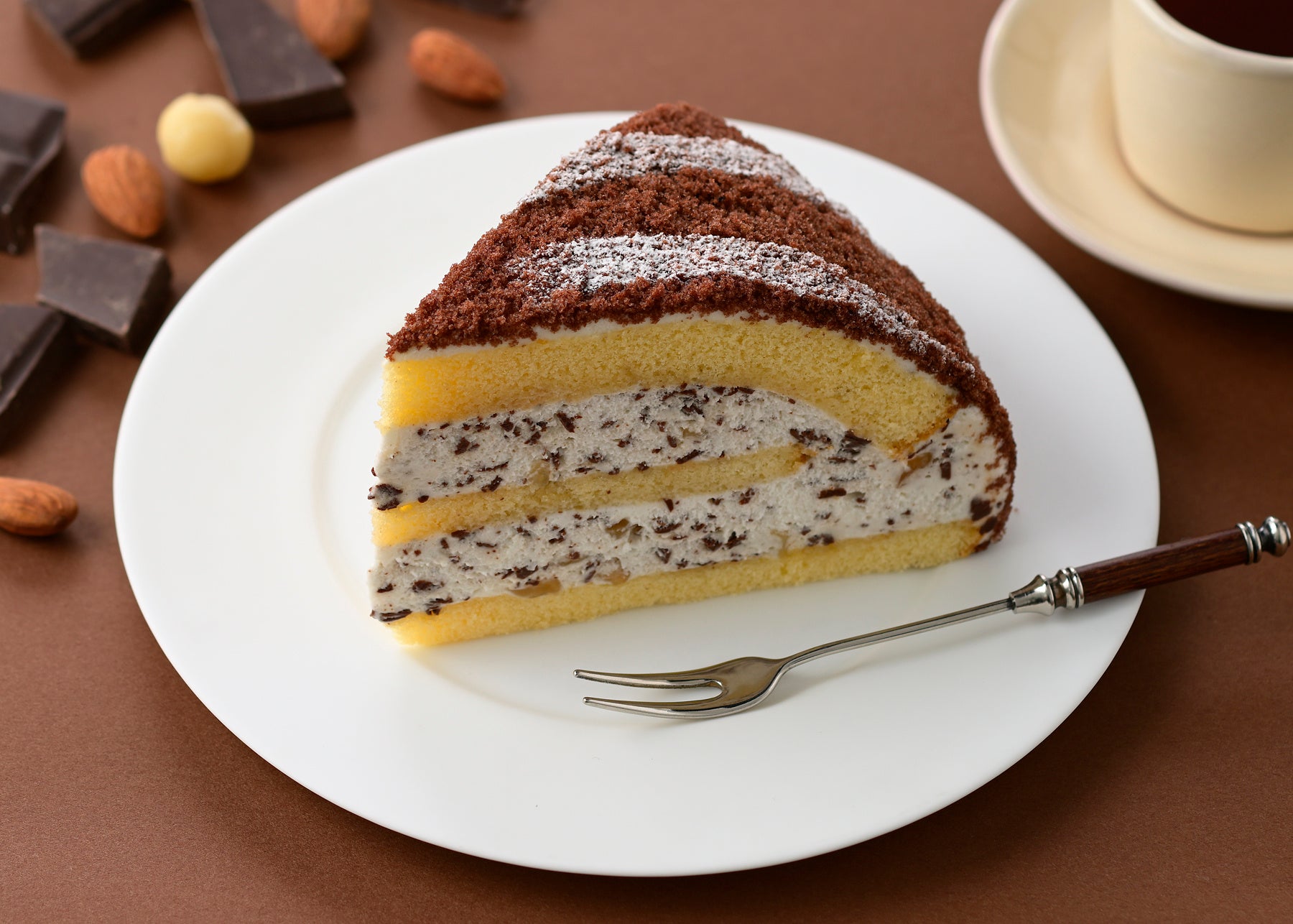 特長:生クリーム入りホイップクリーム(ローストマカダミアナッツ・ローストアーモンド・チョコチップ入り)を風味豊かなアーモンドスポンジでサンドしました。“ズコット”はイタリアの伝統菓子で、形が聖職者がかぶるドーム型の帽子(=ズコット)に似ていることにその名が由来します。