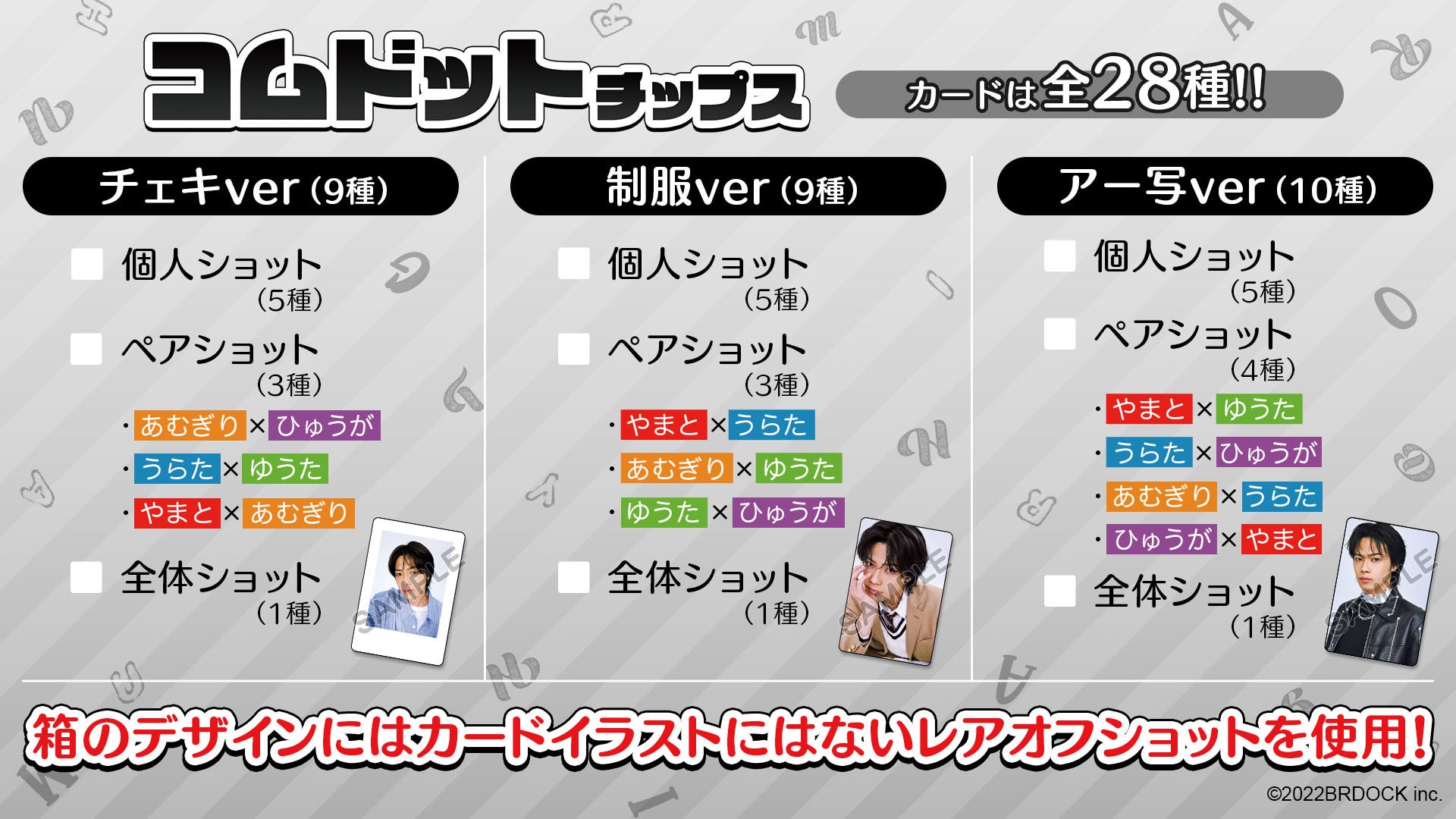 1箱4袋入りのアミューズメント限定BOXのみでの展開となり、カードイラストには使用していないレアオフショットを使用したBOXデザインを全2種ご用意しております。1袋につき1枚、このチップスでしか手にはいらないコムドットの限定撮り下ろしカードがランダムで付いてきます。
