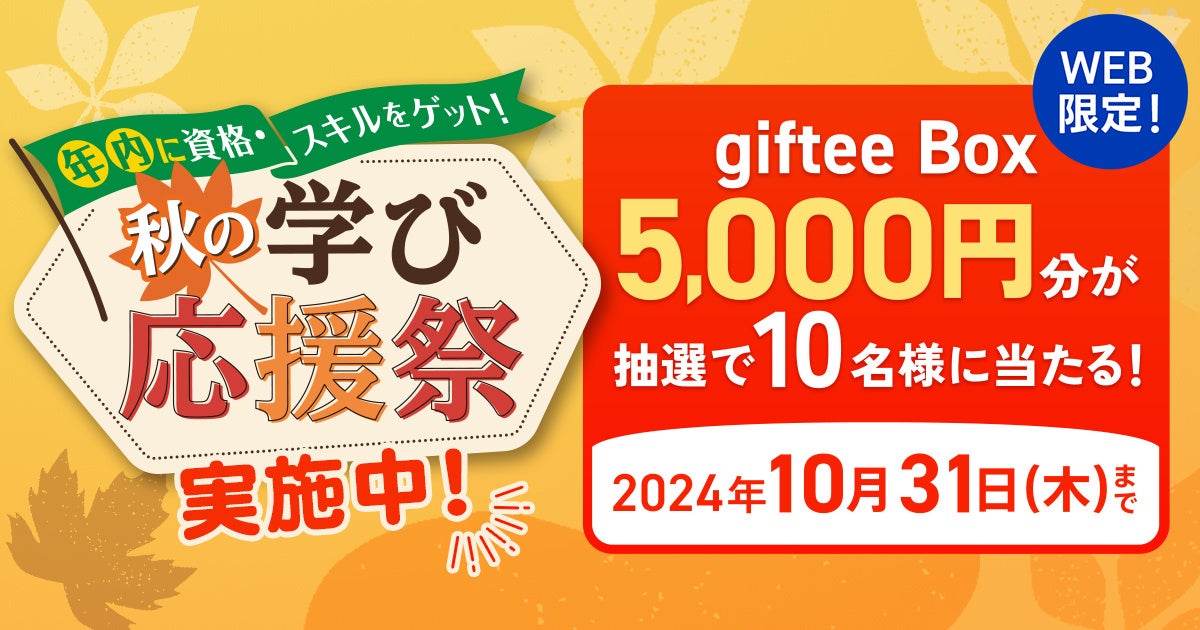 株式会社ユーキャンでは、2024年10月17日(木)より抽選で10名様に5,000円分のgiftee Boxが当たるWEB限定キャンペーン『年内に資格・スキルをゲット!秋の学び応援祭』を開始しました。