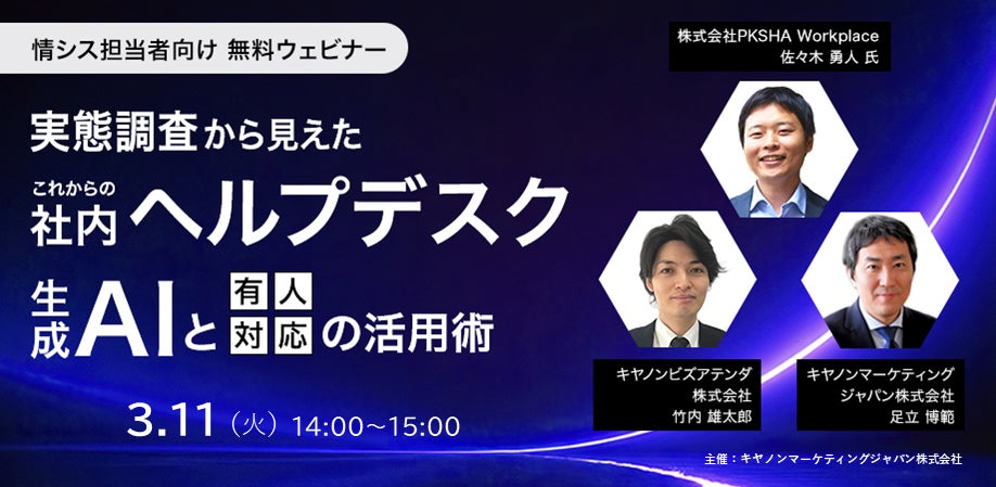 キヤノンマーケティングジャパン株式会社(本社:東京都港区、代表取締役社長:足立正親、以下キヤノンMJ)は、生成AIの活用や有人対応のあり方など、社内ヘルプデスクを進化させる方法について解説する無料ウェビナー「実態調査から見えたこれからの社内ヘルプデスク~生成AIと有人対応の活用術~」を2025年3月11日(火)に開催します。