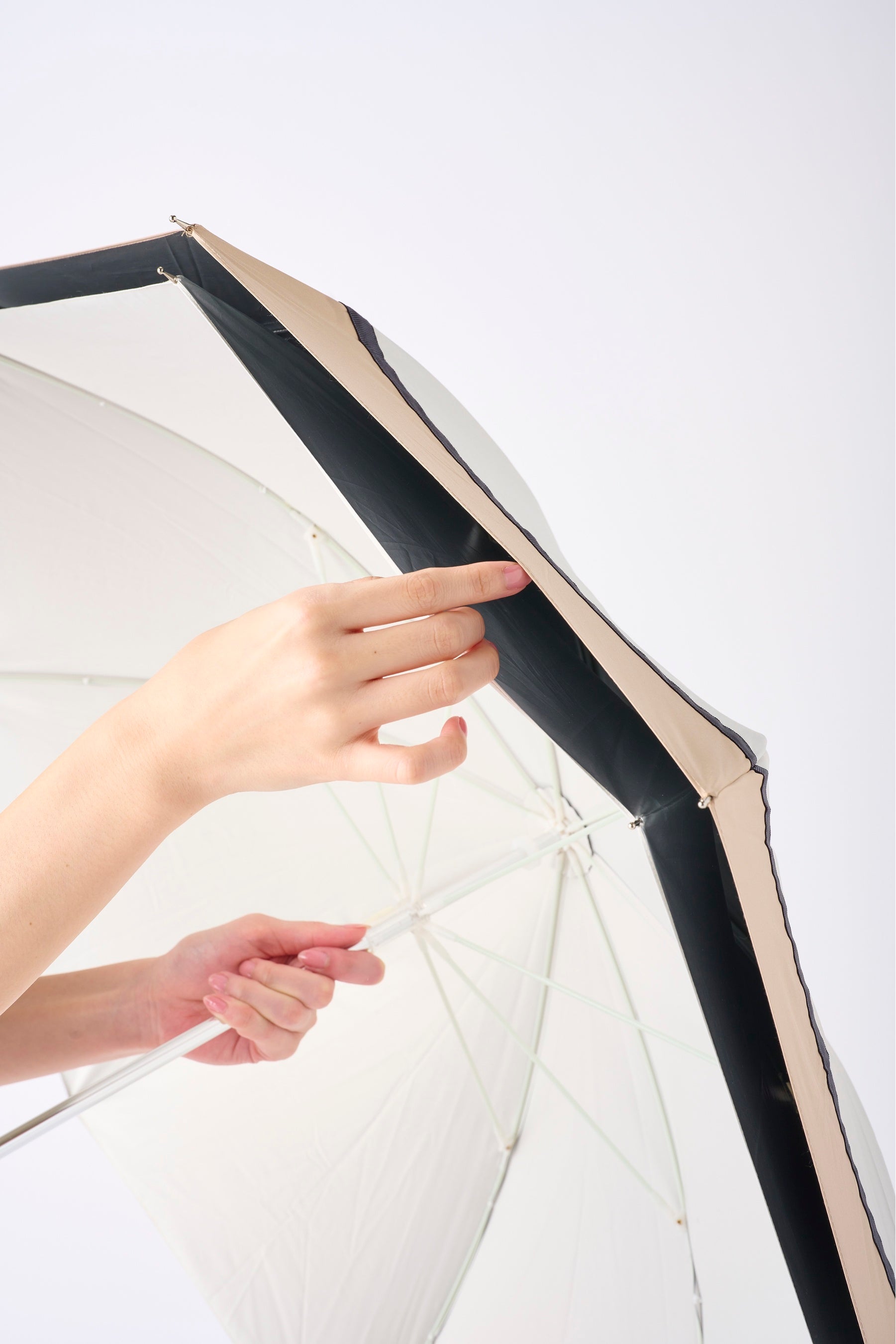 ペットボトルを再生利用したポリエステル生地、持ち手の素材にはバンブーファイバーを混合したサステナブルな傘。生地裏面にポリウレタン樹脂の多層コーティングが施されているので遮光率は100%。