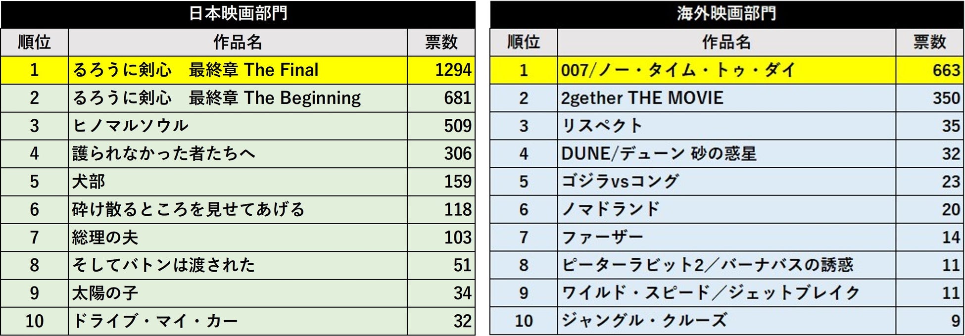 当初は2020年7月に公開予定でしたが、コロナ禍の影響で公開延期を余儀なくされたシリーズ最終章ということもあり、今回受賞の2作品には大変注目が集まりました。3位には田中圭主演、長野オリンピック・スキージャンプチームの実話を描いた『ヒノマルソウル』が、4位には、第1位、第2位でも主役を務めた佐藤健が主演の『護られなかった者たちへ』、10位にはカンヌ映画祭で邦画初の脚本賞を受賞し、ゴールデングローブ賞の非英語映画賞など国内外で多数の賞を受賞しており、「第76回毎日映画コンクール」では最多の10部門にノミネートされている『ドライブ・マイ・カー』がランクインしました。