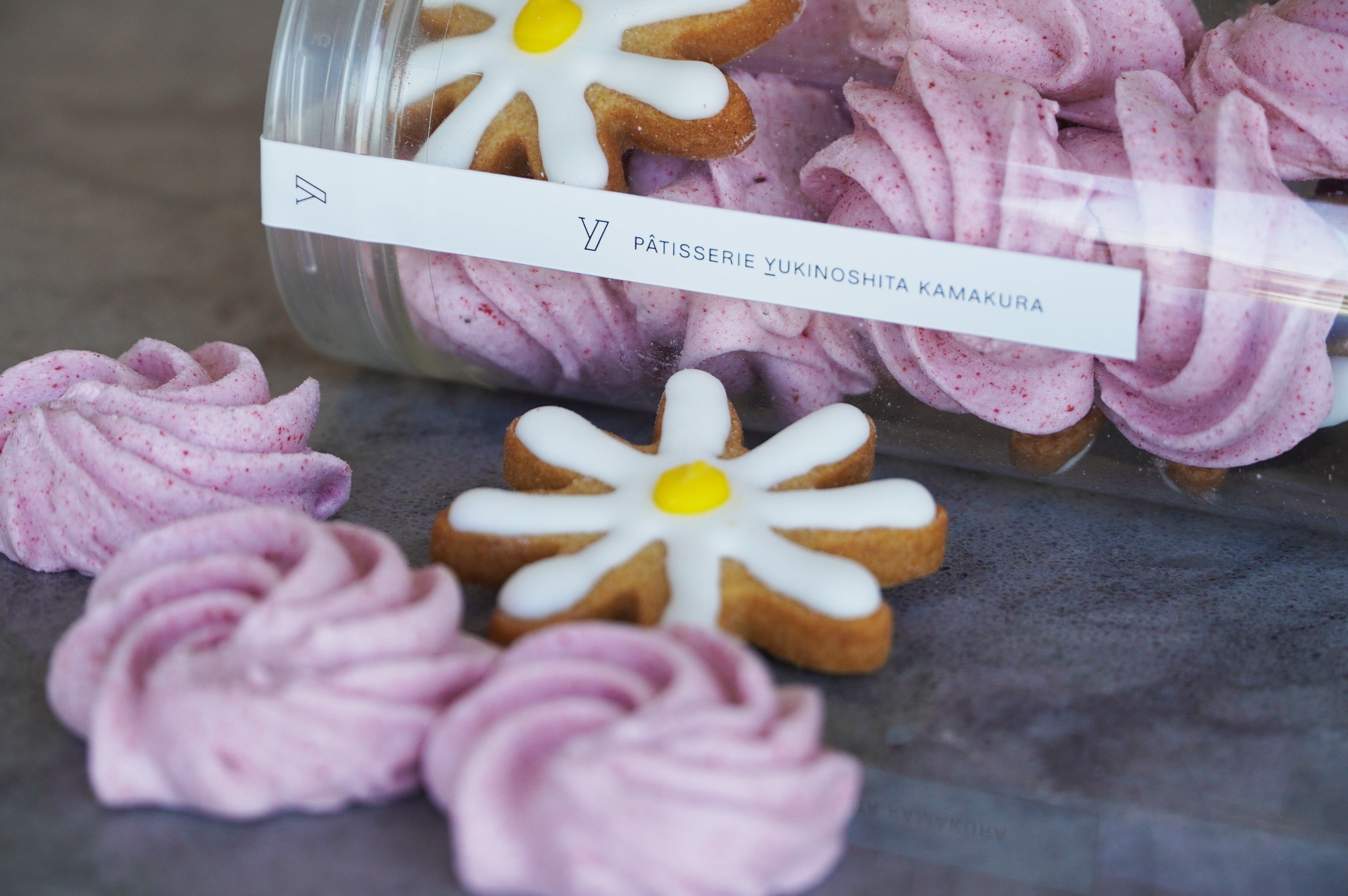 いちごの甘酸っぱいメレンゲ菓子と花形のアイシングクッキーの詰め合わせ