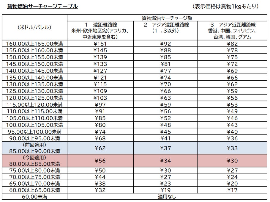 JALは、2025年6月1日から適用となる日本発国際貨物燃油サーチャージを国土交通省へ申請しました。基準となる2025年4月のジェット燃料の平均価格が1バレルあたり80.68米ドルであったことから、燃油指標価格を「80.00以上85.00未満」とし、サーチャージ額は1kgあたり56円(米州・欧州など遠距離路線)、34円(アジア遠距離路線)、30円(アジア近距離路線)となります。