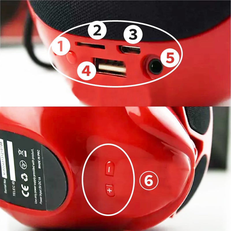 ①電源 ②メモリーカード ③充電差し込み口 ④USB ⑤AUX端子 ⑥音量ボタン