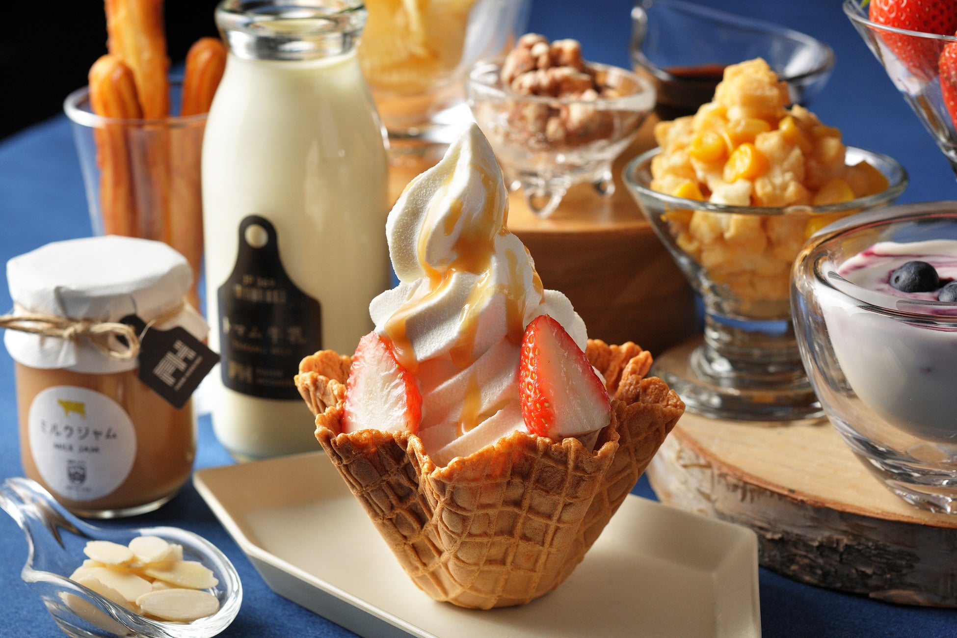 トマム牛乳のソフトクリームを楽しめるコーナー「ソフトクリームステーション」が誕生しました。トマム牛乳のソフトクリームに、ミルクジャムや北海道らしい小豆、とうきびおかきなど、約15種類のトッピングを自由に選んで組み合わせることができます。また、スタッフがトマム牛乳の特徴を説明しながら提供するため、食体験を通じて「ファーム星野」の取り組みについてより深く知ることができます。