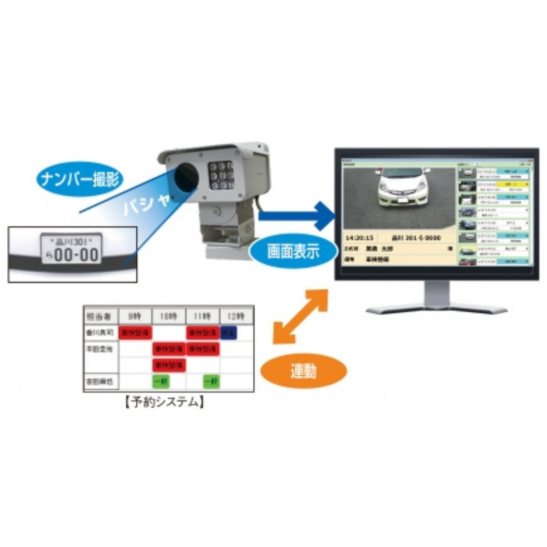 店舗入り口付近に設置したカメラから、来店車両のナンバーを読み取り、店内にお知らせするシステムです。基幹システムとのオンラインもしくは簡易予約機能を使用することで、顧客名、来店目的を表示することが可能です。