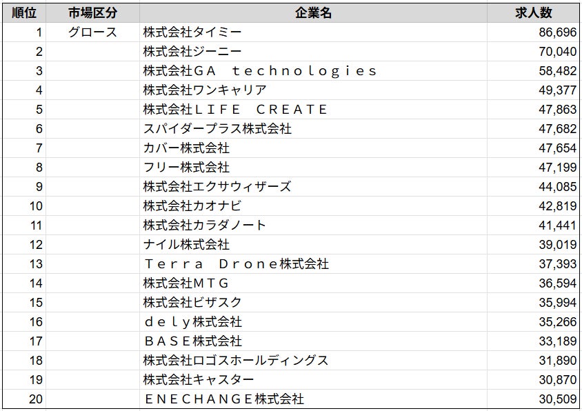 株式会社SalesNow(本社:東京都渋谷区、代表取締役:村岡功規、以下「当社」)は、国内540万社の企業情報を完全網羅した日本最大級のデータベース「SalesNow DB」より、グロース市場に上場する企業の求人数ランキングを集計しました。
