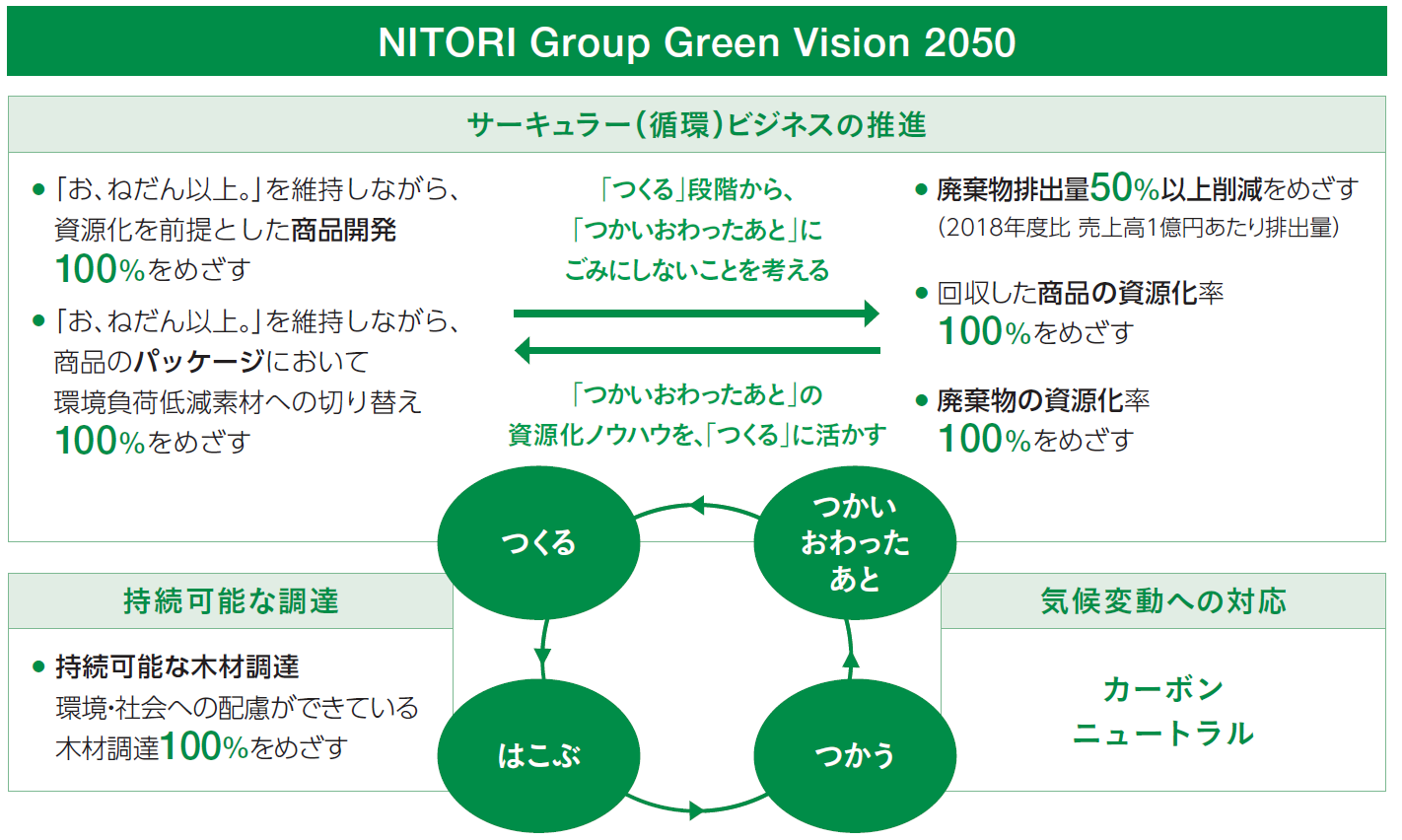 私たちニトリグループは「暮らしの豊かさを世界の人々に提供する。」というロマン(志)を掲げ、その実現に向け歩みを進めております。持続可能な「暮らしの豊かさ」実現に貢献するための、2050年に向けた目標である「NITORI Group Green Vision 2050」のなかで、サーキュラー(循環)ビジネスの推進の一環として、「回収した商品の資源化率100%をめざす」という目標を掲げています。