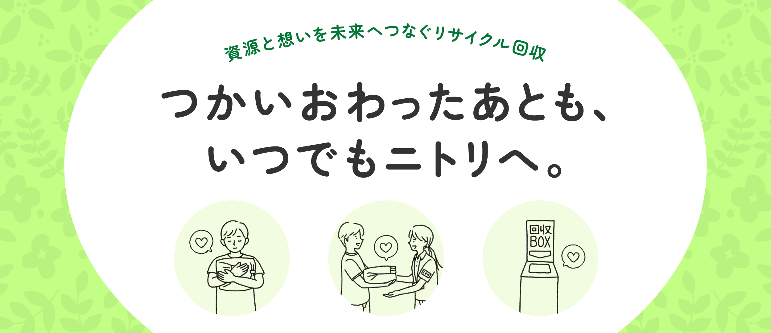 商品をつかいおわったあとも、“いつでも”ニトリにお持ち込みいただき、安心してつぎのお買い物を楽しんでいただきたいと考えております。カーテン・タオル・羽毛布団の回収も常時受付中です。