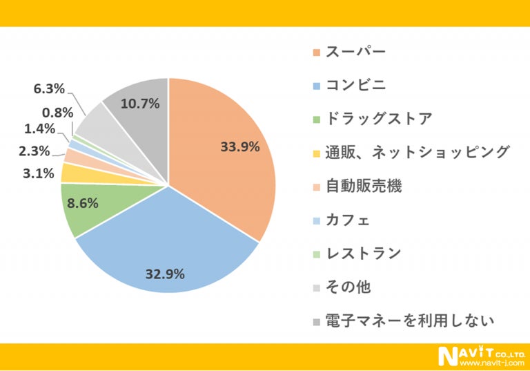 「どこで電子マネーを最も利用しますか?」という質問については、「スーパー」が33.9%、「コンビニ」が32.9%、「ドラッグストア」が8.6%という順になりました。