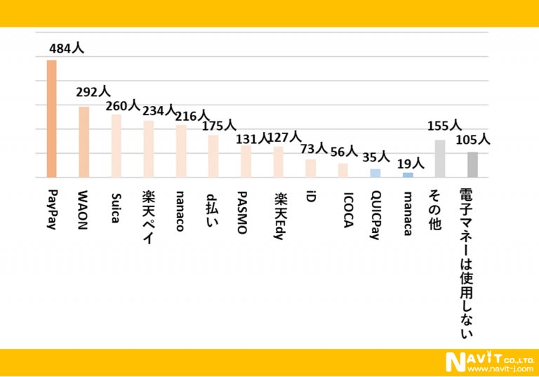 「どの電子マネーを利用していますか?」という質問を複数回答可で行ったところは、「PayPay」が484人、「WAON」が292人、「Suica」が260人という順になりました。