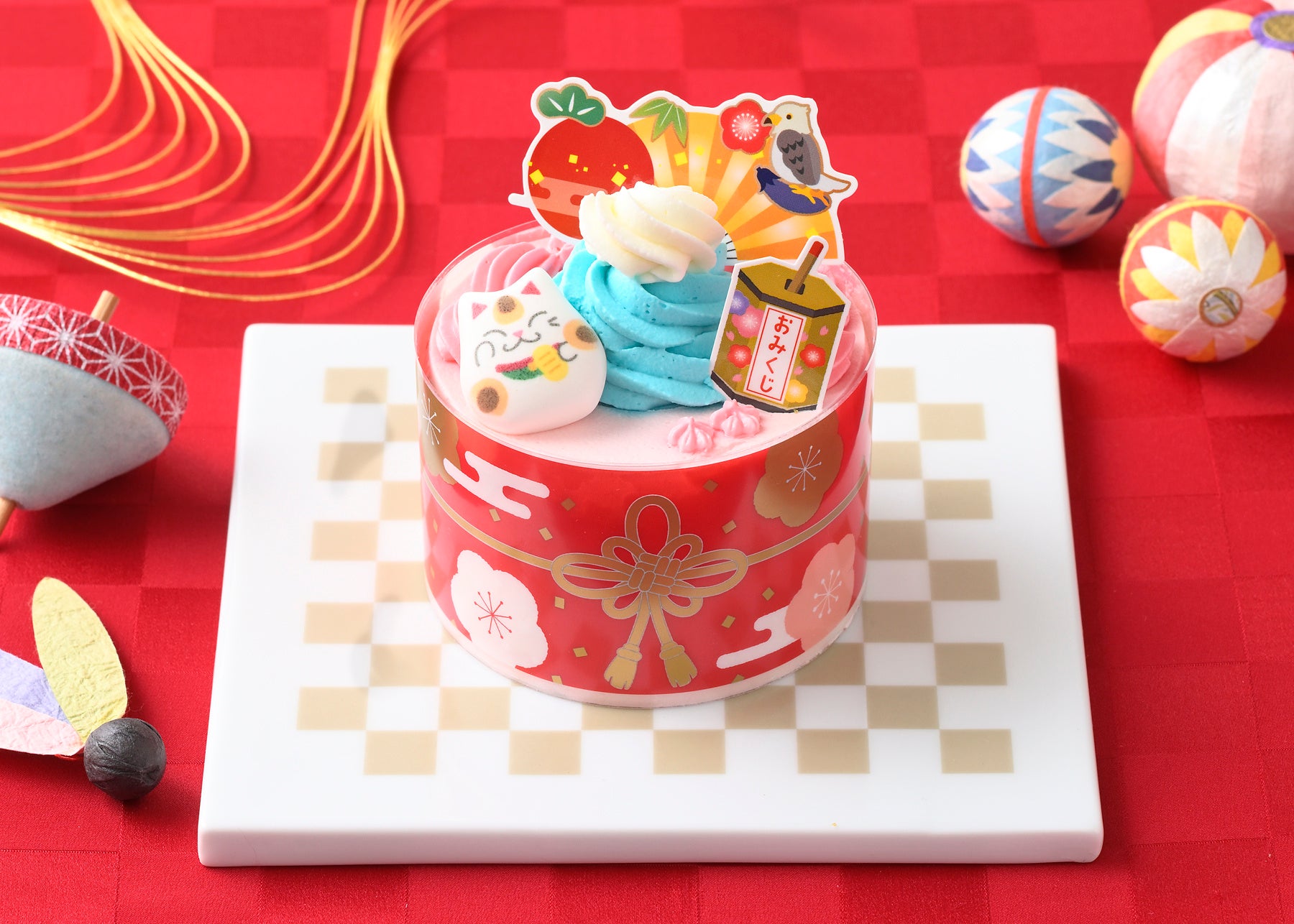 特長:2025年の「スイーツ初め®」にぴったり!招き猫、富士山、初日の出など、縁起のいいお正月モチーフをぎゅっと詰め込んだケーキです。苺クリームをサンドしたふわふわのココアスポンジの上に、レモンクリームで富士山を表現しました。おみくじピックの足部分には「大吉・中吉・小吉」のおみくじが付いています。