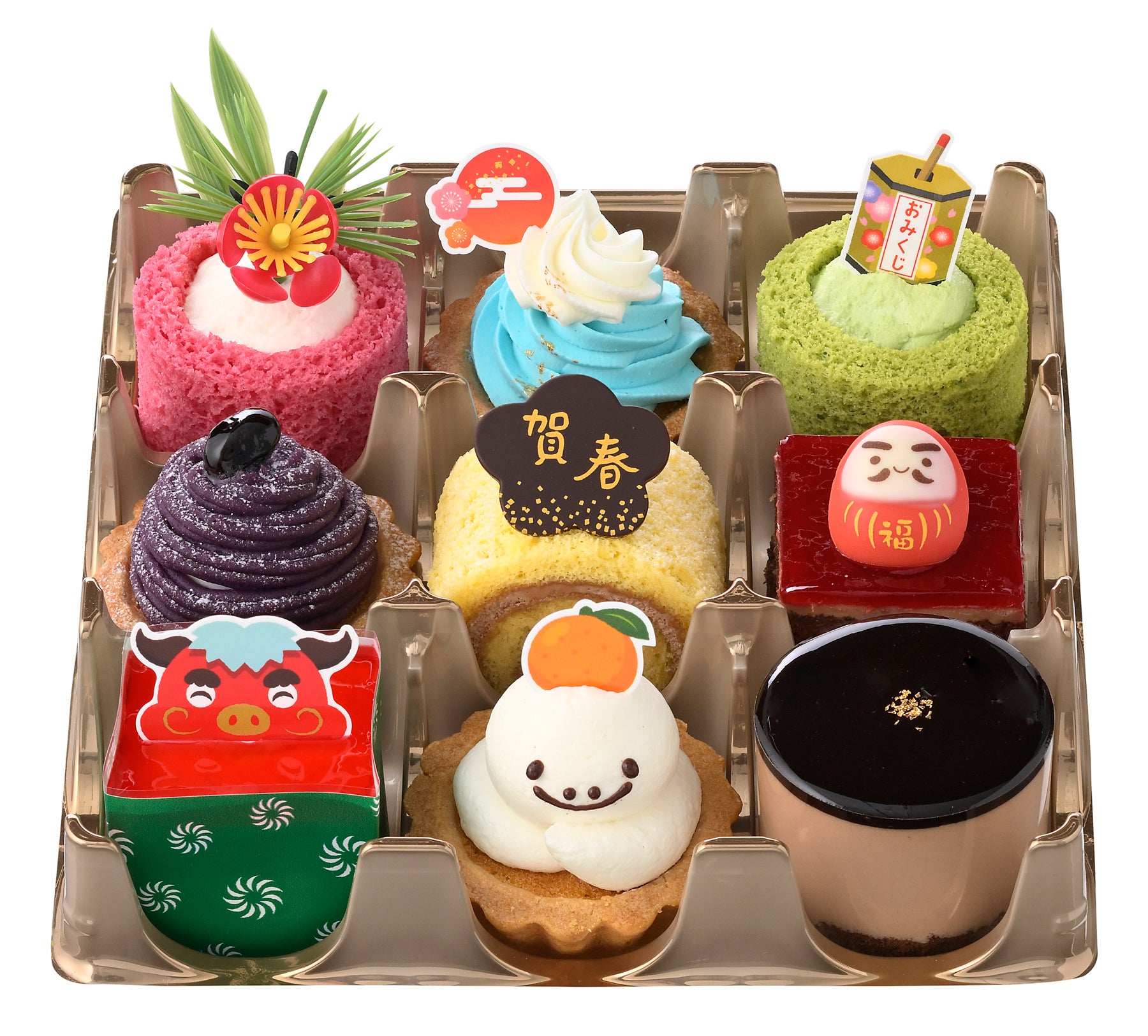特長:2025年の「スイーツ初め」にぴったり!干支の”巳(み)”や初日の出をモチーフにしたタルト、だるまの形をしたチョコを飾ったケーキなど、9種のプチケーキをおせちのお重をイメージしたボックスに詰め合わせました。おせち料理のあとはスイーツを食べて、にっこり笑顔で新たな年をお迎えください。