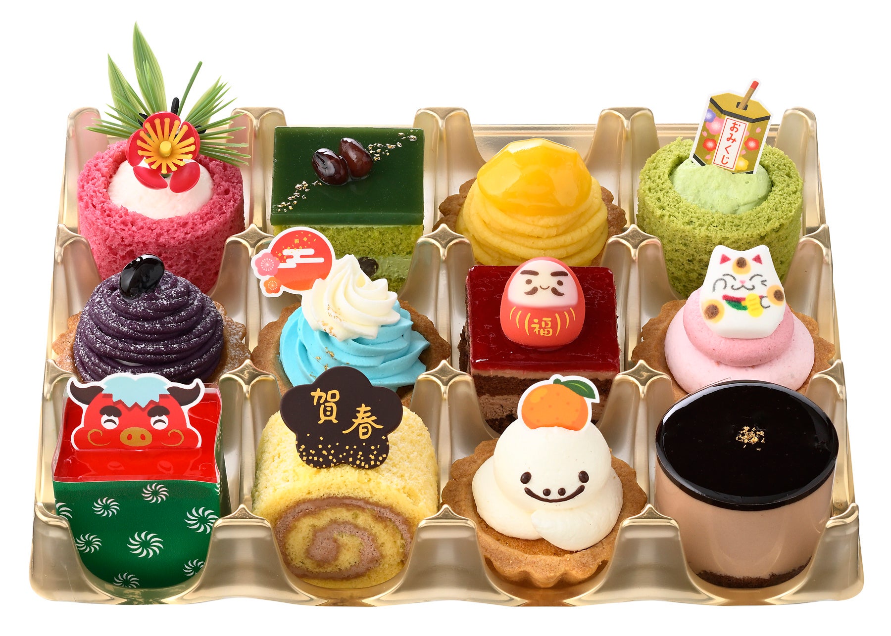 特長:2025年の「スイーツ初め」にぴったり!干支の”巳(み)”や初日の出をモチーフにしたタルト、だるまの形をしたチョコを飾ったケーキなど、12種のプチケーキをおせちのお重をイメージしたボックスに詰め合わせました。おせち料理のあとはスイーツを食べて、にっこり笑顔で新たな年をお迎えください。