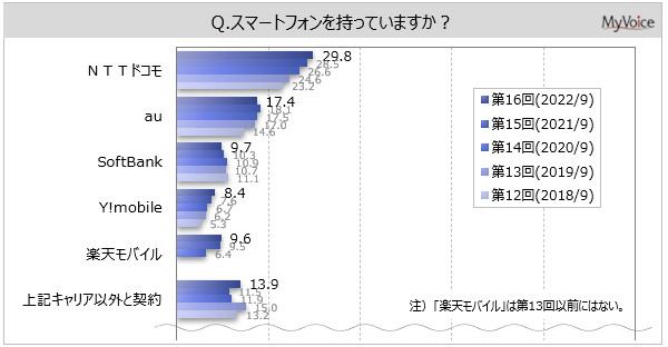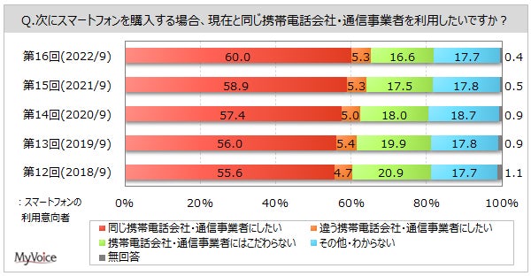 | <今 回>(2022/9)https://myel.myvoice.jp/products/detail.php?product_id=29008 ※上記設問の他に、スマートフォンの「購入時期」「満足度」も聞いています。 <第15回>(2021/9)https://myel.myvoice.jp/products/detail.php?product_id=27807 <第14回>(2020/9)https://myel.myvoice.jp/products/detail.php?product_id=26609 |