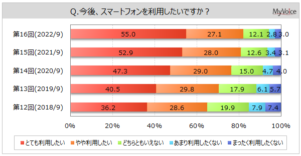 【スマートフォンに関する調査】スマホの利用意向、「とても利用したい」が55%で増加傾向。次回も「同じ携帯電話会社・通信事業者にしたい」は利用意向者の6割、NTTドコモ主利用者で比率高い