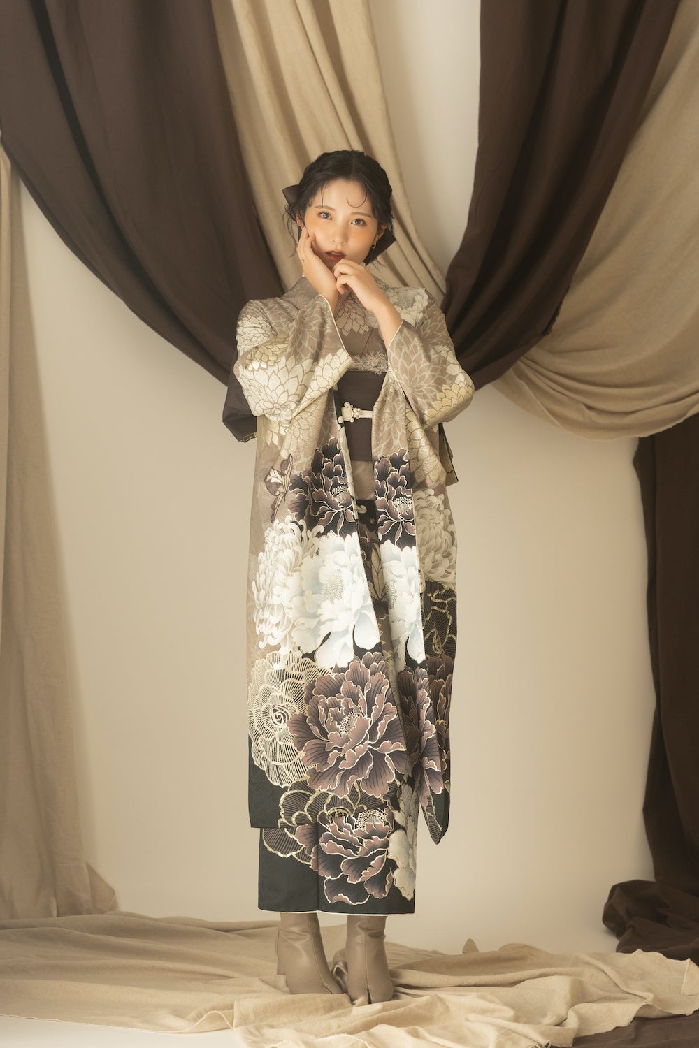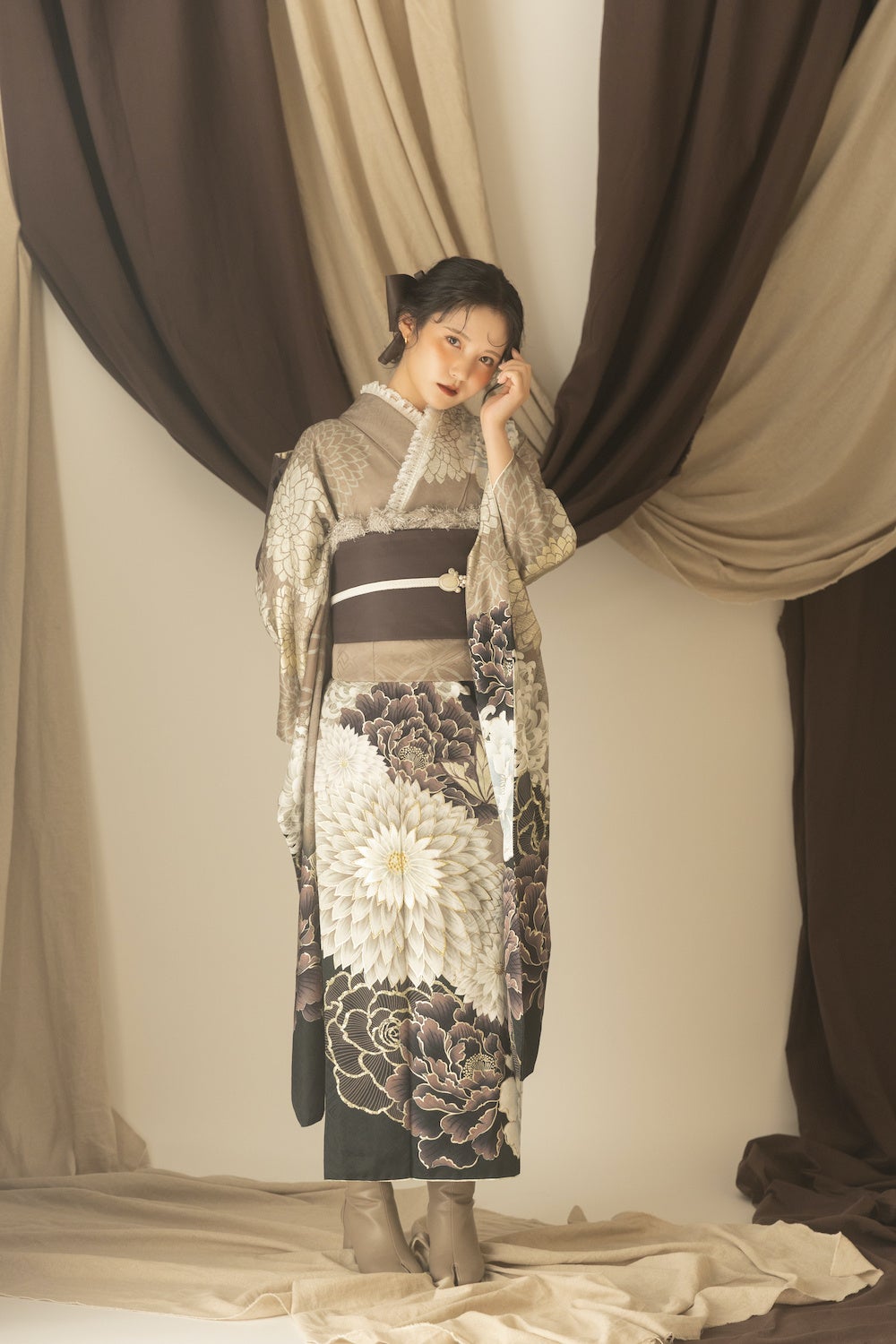 新作のブラウン振袖は、全体に華やかな柄が入っているので