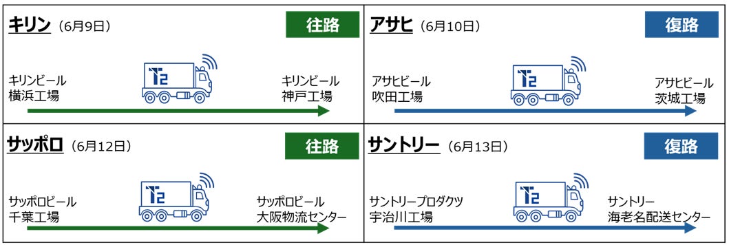 本実証にはアサヒロジ株式会社(社長 児玉徹夫)、サッポログループ物流株式会社(社長 服部祐樹)およびサントリーロジスティクス株式会社(社長 髙橋範州)の酒類・飲料の物流子会社3社も参画(以下、キリングループロジスティクス株式会社とあわせて「4社」)します。4社は、関東から関西までの高速道路の往復路で製品の容器・重量を変えてそれぞれが幹線輸送し、自動運転トラックによる輸送の有効性と具体的なオペレーションをT2と検証します。