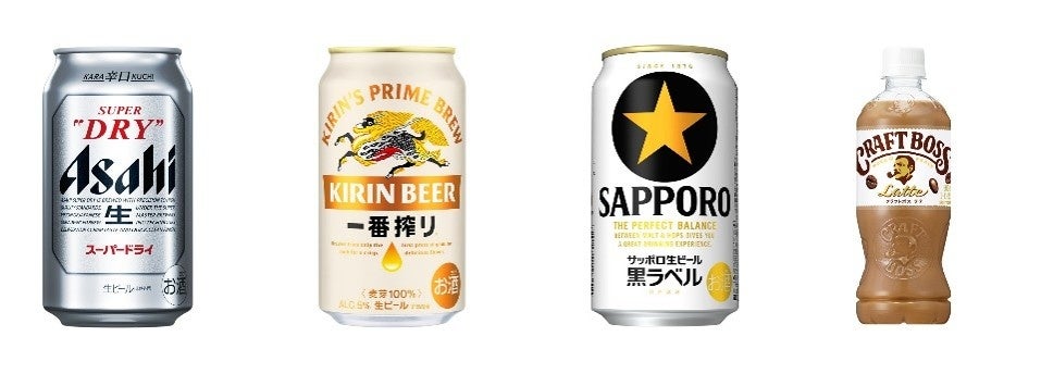 左から、アサヒ「アサヒスーパードライ」、キリン「キリン一番搾り生ビール」、サッポロ「サッポロ生ビール黒ラベル」、サントリー「サントリー クラフトボス ラテ」