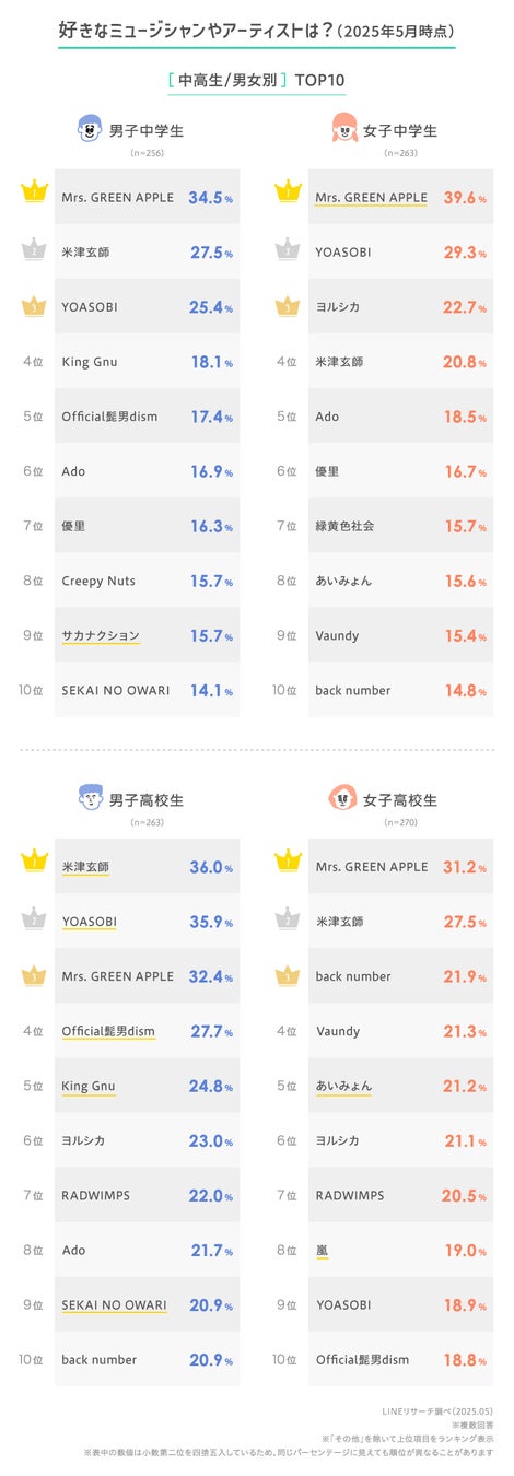 【LINEリサーチ】中高生の好きなミュージシャンTOP3は「Mrs. GREEN APPLE」「米津玄師」「YOASOBI」