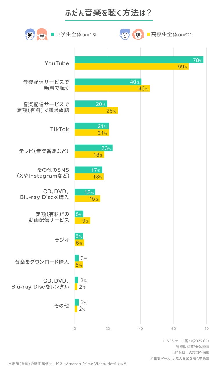 「YouTube」が中高生で圧倒的に人気。高校生は有料音楽配信サービスの利用が中学生より高い。