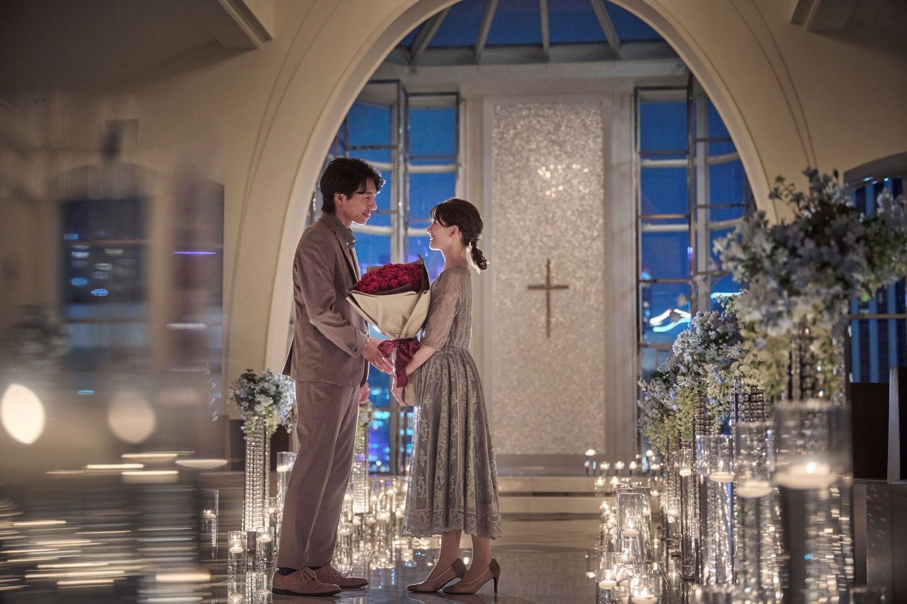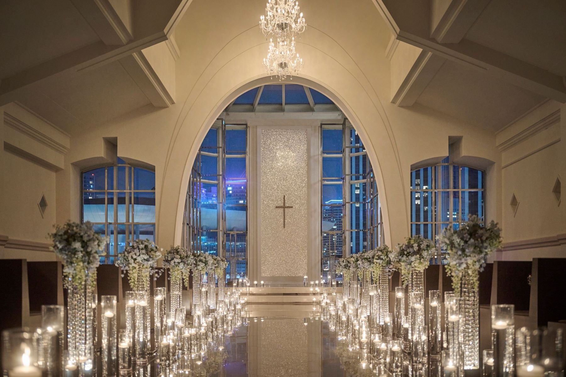 プロポーズの舞台となるのは、美しいみなとみらいの夜景が祭壇越しに広がるガラスのチャペル。20メートルのバージンロードにはキャンドルが美しく輝き、祭壇にはマザーオブパールと呼ばれる貝殻が張り巡らされ、横浜の空と海を感じられるチャペルをふたりきりで貸し切って、まるでドラマの主人公になったかのような、一生の想い出に残るロマンティックなプロポーズが叶います。