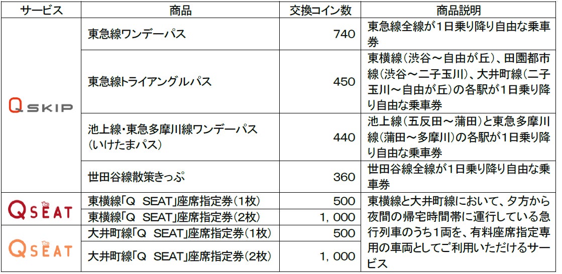 SEAT」の座席指定券の購入で、利用金額に対し最大3%のコインが東急線アプリ内に貯まり、東急線に関する商品に交換できるサービスです。