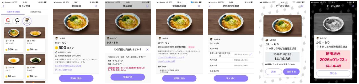 ・「しぶそば」全店で「TOQ COIN」で貯めたコインを商品に交換できます。