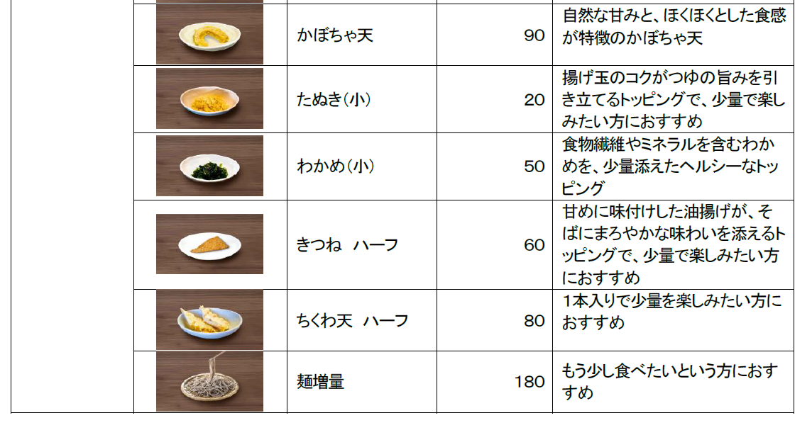 本日から、かけそば・もりそばや、ちくわ天、海老天を始めとするトッピングなど計14商品が