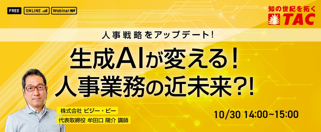 公認会計士や税理士など、多くの国家資格や検定試験の受験指導などの教育事業を展開しているTAC株式会社(東京都千代田区、代表取締役:多田敏男)は、法人向け人材教育部門から、人事・教育担当者に向け「生成AIが変える!人事業務の近未来?!」セミナーを2024年10月30日(水)に実施します。