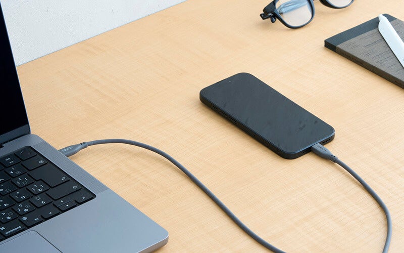 スタンダードタイプに加え、断線リスクを軽減する「高耐久タイプ」、取り回しやすい「なめらかタイプ」の3種類をラインアップし、用途に合わせて選べます。コネクター部分には仕様を印字し、一目でコードの仕様を確認できます。従来のUSB充電機器から最新のUSB Power Delivery EPR対応機器まで、これ1本で充電できます。