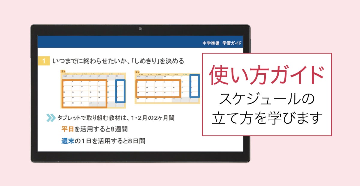 使い方ガイドやホームルーム映像で、スケジュールの立て方を具体的にレクチャーします。「中学準備ステージ」での計画立てが、「しめきり」を決め、「何を」「どのくらい」やるのか確認し、スケジュールに割り振るトレーニングになります。