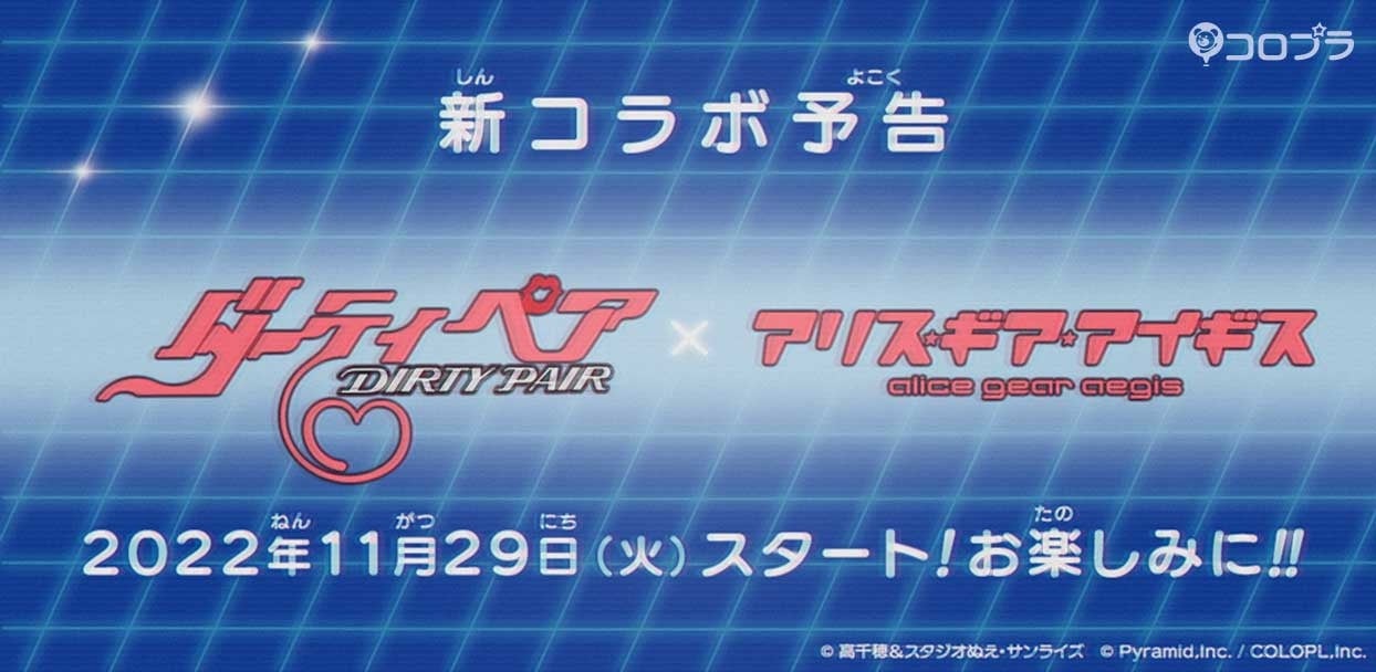 株式会社コロプラ(代表取締役社長:宮本貴志、本社:東京都港区、以下「コロプラ」)は、スマートフォン・PC向けゲーム『アリス・ギア・アイギス(以下、アリスギア)』と『ダーティペア』のコラボイベントが2022年11月29日(火)から開催決定したことをお知らせいたします。