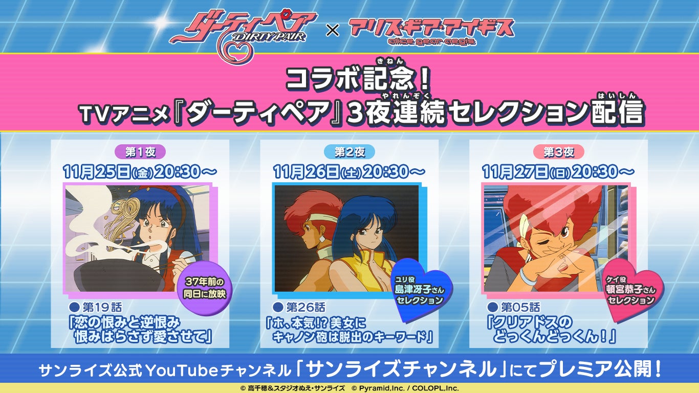 本コラボを記念して、TVアニメ『ダーティペア』のセレクション回の配信が決定いたしました!頓宮 恭子様(ケイ役)、島津 冴子様(ユリ役)もセレクトしたエピソードを3夜連続でお届けいたします!