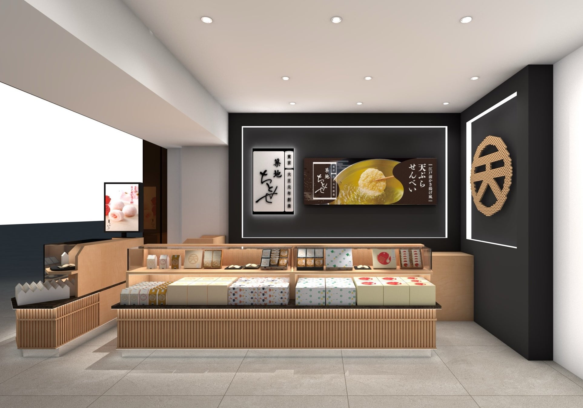当ブランドの人気NO.1商品である天ぷらせんべいのモチーフを壁面に掲げた、これまでの店舗の印象とは異なる、大正元年から続く老舗和菓子屋として更に洗練された店舗へと生まれ変わりました。リニューアルした店舗で気持ちを新たに、お客様への感謝の想いは変わらずに、皆様を大切にお迎えいたします。