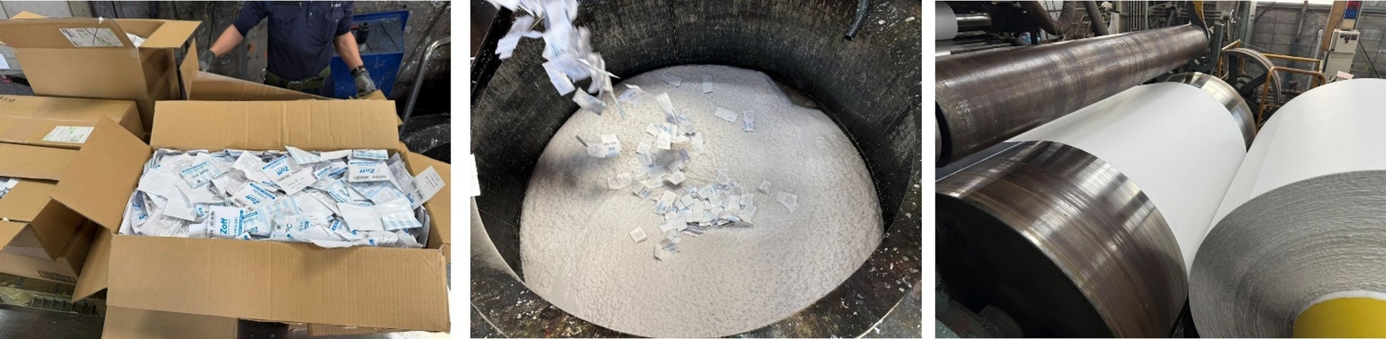 店舗で役目を終えたレンズ包装紙は、回収後、さまざまな工程と多くの人の手を経て、「Zoff x Campus」オリジナル キャンパスノートの表紙として新たな役割を担います。その生まれ変わりのプロセスの一部をご紹介します。