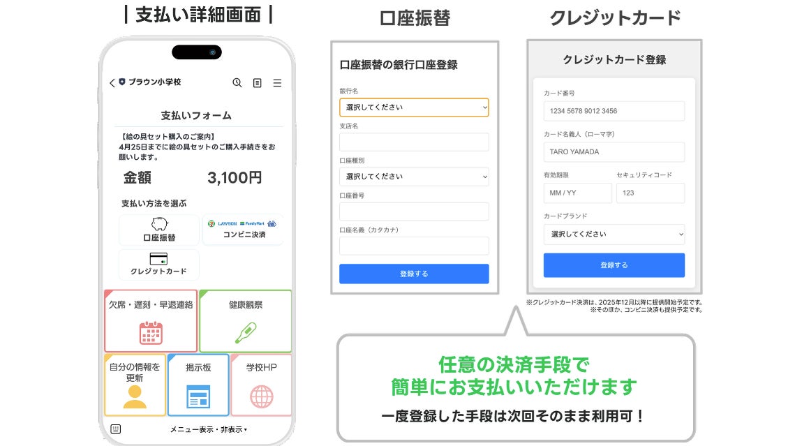 保護者側の支払い方法として、口座振替のほか、順次クレジットカードやコンビニ決済にも対応予定のため、それぞれの保護者の環境に合わせて、支払い方法を選択可能です。