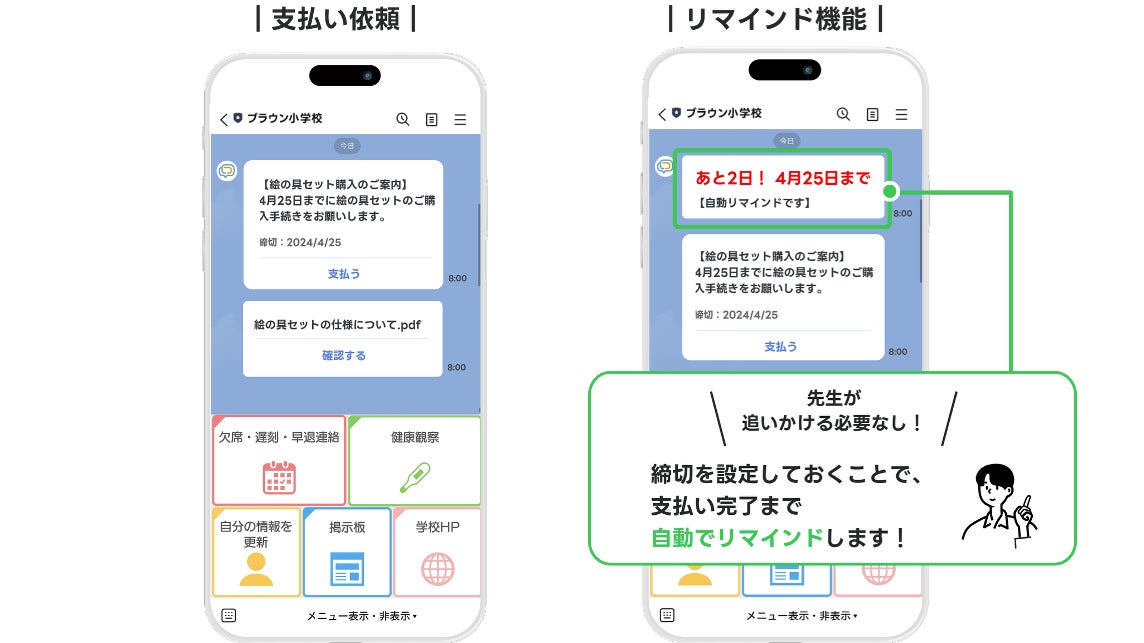 これにより学校は、保護者への支払い依頼や、支払い期限に合わせたリマインドの自動送信、支払い状況の確認を教職員専用の管理画面上(※2)で行うことができます。学校が送信した支払い依頼やリマインドは、各学校の「LINE公式アカウント」を通じて保護者に届き、さらに、そのままトークルームから支払いに進めるため(※3)、お知らせの見逃しや、支払い忘れを防ぎやすい点が特徴です。