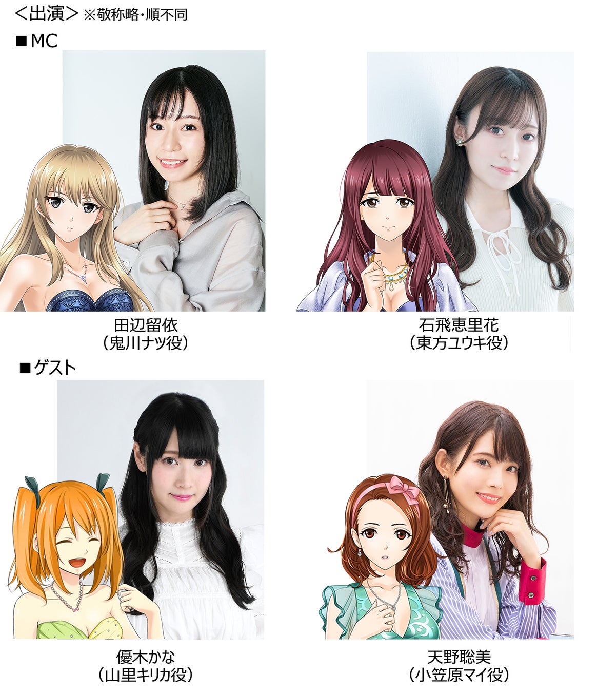 本番組は、美女と共に六本木に潜む悪と戦うサスペンスアドベンチャーゲーム「六本木サディスティックナイト」の公式YouTube番組です。この度、アプリの配信7.5周年及びボイス実装を記念して、6月10日(土)に初となる公開生放送の実施が決定しました。田辺留依さん(鬼川ナツ役)、石飛恵里花さん(東方ユウキ役)のMC二人に加えて、特別ゲストとして優木かなさん(山里キリカ役)、天野聡美さん(小笠原マイ役)も出演。ボイス収録時の様子を語っていただくほか、配信をご覧の皆様、そしてご来場の皆様と一緒に六本木サディスティックナイトを盛り上げるゲーム企画など、公開生放送ならではのスペシャルな内容でお届けいたします。