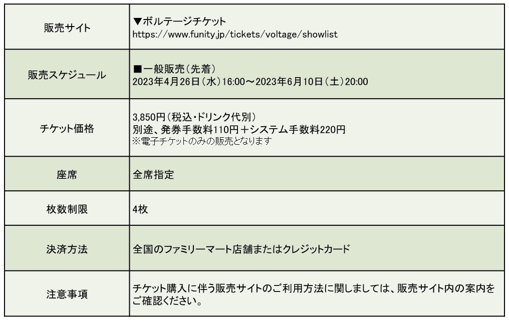 チケット価格 | 3,850円(税込・ドリンク代別) 別途、発券手数料110円+システム手数料220円 ※電子チケットのみの販売となります |