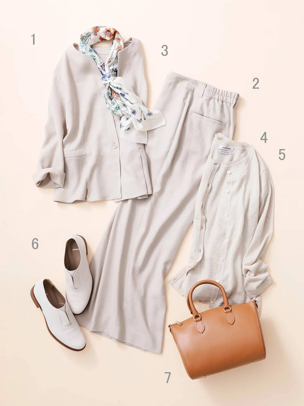纏うだけで優しい雰囲気になるベージュアイテム。春夏らしいナチュラルで軽やかな素材感も感じられます。今回は、コーデが決まりやすいカセットアイテムに、濃色アイテムと組み合わせたメリハリのある着こなしをご提案。