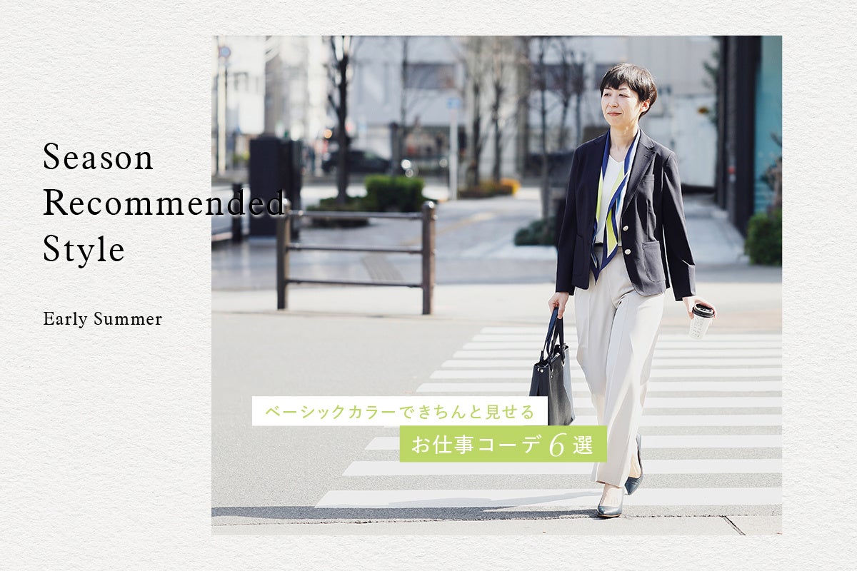 やっぱりベーシックカラーに頼るのが一番。今回のシーズンレコメンド特集では、【ネイビー】【ベージュ】【ブラック&グレー】のカラー別に通勤スタイルをご紹介いたします。汗ばむ夏までロングシーズンで着用可能なスタイリングをぜひご覧ください。