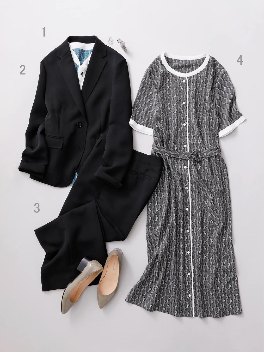 初夏の日差しにコントラストをつけてくれるブラックとグレーは、纏うだけで身も引き締まり、シャープな印象を与えてくれます。今回はデイリーな通勤スタイルから出張にもぴったりの、柔らかくシワになりにくい、ポリエステル100%のアイテムを軸にしたスタイルをご紹介します。