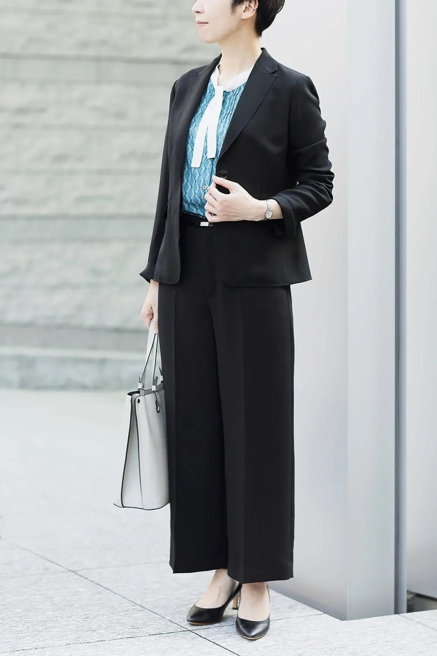 商談や新年度の挨拶など、アクティブに活動する季節にぴったりなジャケットセットアップ。ご家庭で洗濯可能で、初夏からロングシーズン着用可能です。インナーには、ボトルグリーンの幾何学柄のボウタイブラウスをチョイス。端正なブラックも、インナーに色柄を取り入れることで、新入社員とも差別化ができ爽やかな印象に。さらに、ボウタイやバッグなど、淡いカラーを取り入れるのが軽さを出すテクニック。