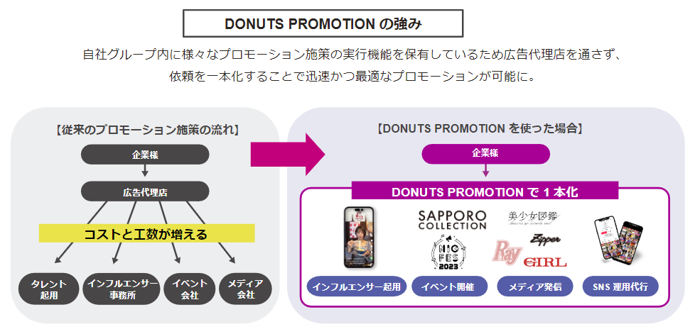 DONUTSは、これまで自社オリジナルのゲームのほか、ライブ配信&動画アプリ「ミクチャ」、北海道最大級のファッションイベント「SAPPORO COLLECTION」の定期開催、女子大生を中心に圧倒的な知名度を誇る女性ファッション誌「Ray」、原宿発のファッションクリエイターズマガジン「Zipper」のほか、2023年3月に復刊したアラサー女性のためのファッション雑誌「andGIRL」や「mamagirl」といった、雑誌発行や関連デジタルメディアの展開など、DONUTSの他事業との連携によって生まれるシナジーを最大に活かした“Z世代層”中心のプロモーションを得意としています。