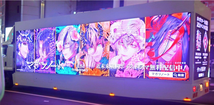 トラックの荷台スペースに大きな広告を掲示し、その状態で公道を走行する屋外広告の一種。人通りの多い繁華街を中心に走行することで、その派手さや同時に流れる音声のスピーカー効果から、 街を行き交う大勢の人やドライバーにアプローチする事が出来ます。
