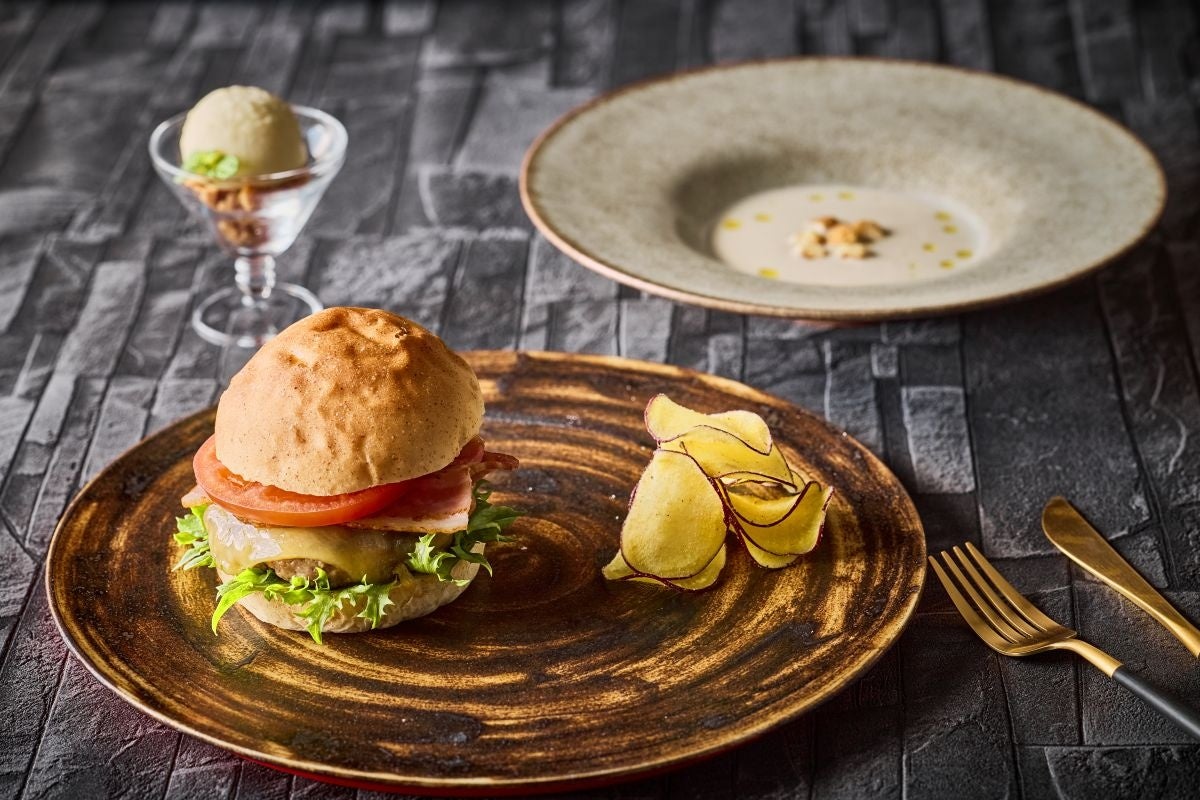 胚芽の香ばしいバンズに食べ応えのあるビーフ100パーセントのパティを贅沢に使用。約230℃の鉄板で一気に焼き上げるパティは、表面はカリッと香ばしく中は上質な肉汁を閉じ込め、一口目から溢れ出る肉本来の旨味を感じていただけます。また、クリーミーさが特徴のホワイトチェダーチーズと相性抜群の赤ワインと玉ねぎをじっくり煮詰めた特製ソースは、ハンバーガーの旨味をさらに引き立てます。付け合わせには、甘みたっぷりの紅はるかをトリュフ風味に仕上げた贅沢なチップスをご用意。そして、ハンバーガーとセットで季節の食材を使用したスープやアイスクリームも合わせて提供いたしますので、ボリューム感のあるランチセットをお楽しみいただけます。