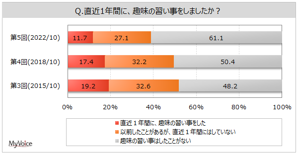 | <今 回>(2022/10)https://myel.myvoice.jp/products/detail.php?product_id=29112 ※上記設問の他に「習い事の情報源」「かかった費用」「実施頻度」「力を入れている習い事」も聞いています。 <第4回>(2018/10)https://myel.myvoice.jp/products/detail.php?product_id=24312 <第3回>(2015/10)https://myel.myvoice.jp/products/detail.php?product_id=20714 |